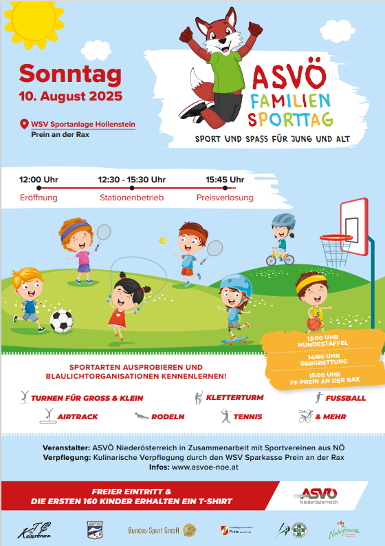 Am 10.8.2025 findet unser Familiensporttag in Prein an der Rax statt. Weitere Infos zu der Veranstaltung und dem Projekt gibt es hier.