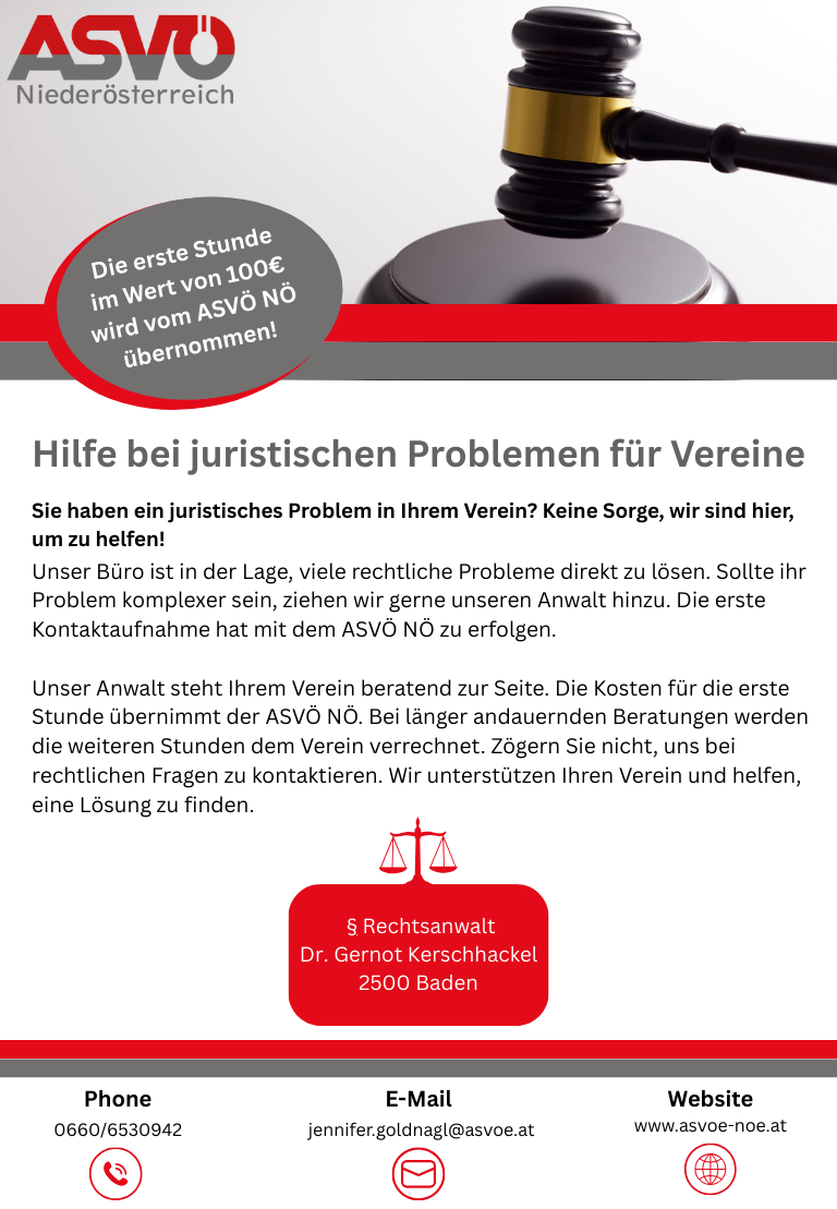Die erste Kontaktaufnahme erfolgt über den ASVÖ-NÖ, der Ihre Anfrage entgegennimmt und an uns weiterleitet. Wir stehen Ihnen dann zur Verfügung, um Ihre rechtlichen Fragen zu beantworten und Ihnen bei der Lösung Ihrer Probleme zu helfen. Der ASVÖ-NÖ übernimmt die Kosten für die erste Beratungsstunde, damit Sie die Möglichkeit haben, sich unverbindlich an uns zu wenden.